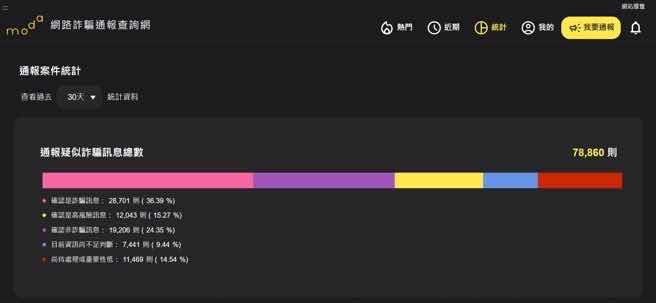 網路詐騙通報查詢網揭露,截至今晚8點,過去30天通報疑似詐騙訊息總數共有78,860則