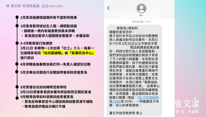 台北市議員張文潔說,教育局直到9月才寄出簡訊「提醒受害家長可以申請心理諮商補助