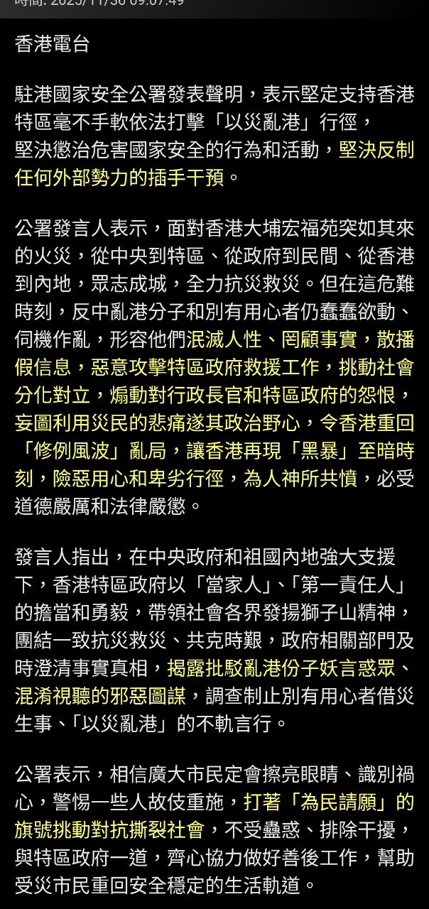 駐港國家安全公署發表聲明,表示堅定支持香港特區毫不手軟依法打擊「以災亂港」行徑,