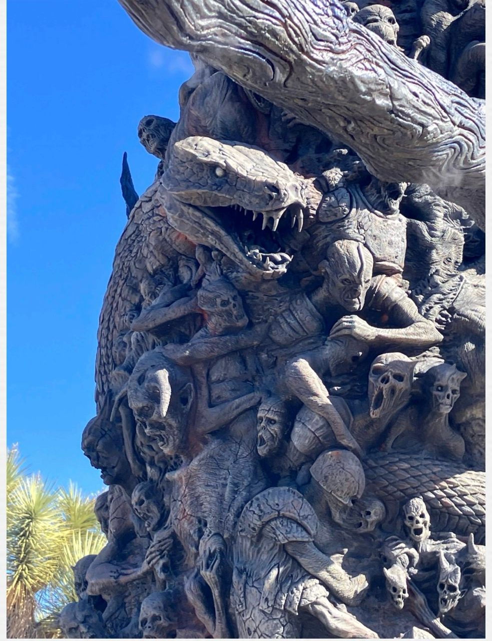 型被各種骷髏、人類、動物、怪物,甚至是神話生物環繞而成,中間還有疑似奇異大門,